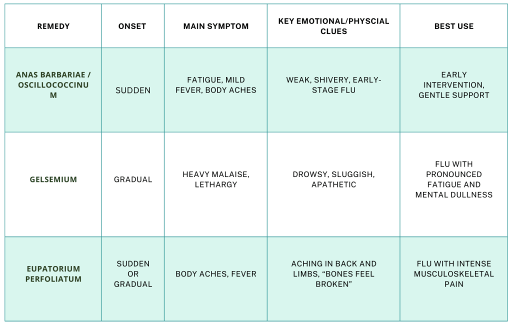 Anas barbariae (Oscillococcinum), Gelsemium, and Eupatorium perfoliatum are all valuable tools for home prescribers during flu season. Choosing the right remedy depends on onset, fatigue, body aches, and overall presentation. Observing these subtle differences can make all the difference in supporting your family safely and effectively.